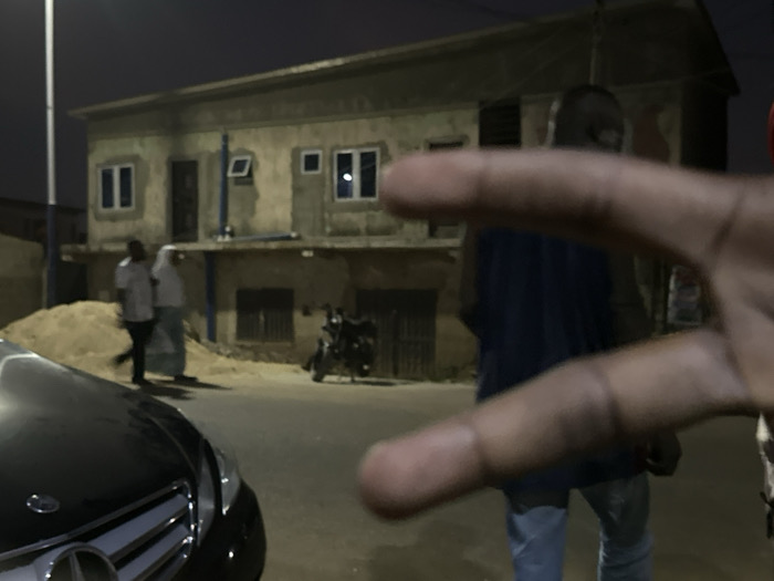 The image depicts an urban scene at night in Sardauna, Nigeria. In the immediate foreground, a dark-skinned human hand with fingers partially extended towards the camera obscures the upper right and lower right portions of the frame. Below the hand and to the left, the grille and front hood of a dark Mercedes-Benz vehicle are visible. In the midground, a person wearing a dark blue top and light-colored trousers stands, partially obscured by the foreground hand. To their left, two individuals are present on an unpaved surface: one wearing a light-colored top and dark trousers, and another in a light-colored head covering and possibly a light-colored garment. A large mound of sand or earth is situated behind these two individuals. Further right, a dark motorcycle is parked on the unpaved ground. The background features a two-story building with unfinished concrete walls. Multiple rectangular windows are visible, some open, with light emanating from within several. A doorway is also present on the ground floor. A street lamp pole stands on the far left of the scene, providing minimal overhead illumination. The overall environment is dimly lit by artificial sources.