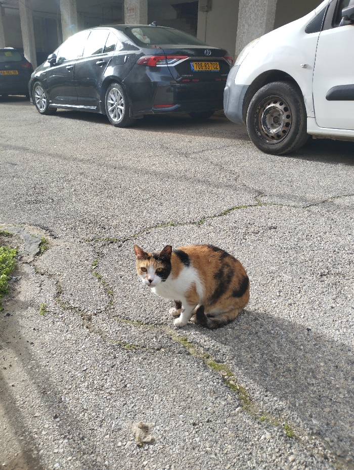 The scene, located in Petah Tikva, Israel, depicts an outdoor paved area under daylight. No people are visible. In the foreground, a calico cat, predominantly white with distinct black and orange/brown patches, is seated on a light grey asphalt or coarse concrete surface, looking directly towards the viewer. The cat casts a shadow to its right. A small, indistinct grayish-brown clump of debris is present on the pavement near the cat. The ground exhibits multiple cracks with minor green vegetation growth. In the mid-ground, a black Toyota Corolla sedan is parked facing away, displaying an Israeli license plate with the registration '706-83-702'. To the left of the Toyota, the rear of another dark-colored vehicle is partially visible. On the right side of the frame, the front bumper and a steel-rimmed wheel of a white vehicle are partially observed. The background reveals building elements, possibly support columns or walls, partially shaded.