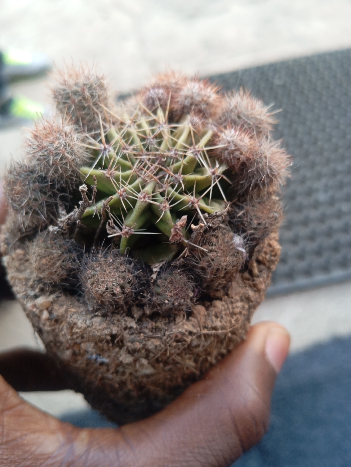 The image depicts a close-up, top-down view of a small cactus plant, held by a human hand. The scene is described as being located in the city of Jos, Nigeria. The central subject is a live, globular cactus, characterized by a light-green main body with defined ribs and clusters of sharp, reddish-brown spines. Surrounding the main cactus are numerous smaller, shriveled offshoots or pups, appearing brownish-grey and densely covered with finer, lighter spines, suggesting a state of desiccation or decay for these smaller growths. The entire plant, including its root system, is encased in a compact, irregular mass of reddish-brown soil, exhibiting varied textures and visible rootlets. A dark-skinned human hand is positioned at the bottom of the frame, firmly gripping the soil mass from beneath. The thumb and parts of the fingers are visible, performing the action of holding and presenting the plant. The background is out of focus, indicating a shallow depth of field. It comprises a light-colored, possibly concrete or tiled, surface, along with a darker, textured, synthetic material, such as a mat or rug, visible on the right side. The scene is illuminated by what appears to be natural, ambient light. No additional individuals or distinct objects are present within the frame.