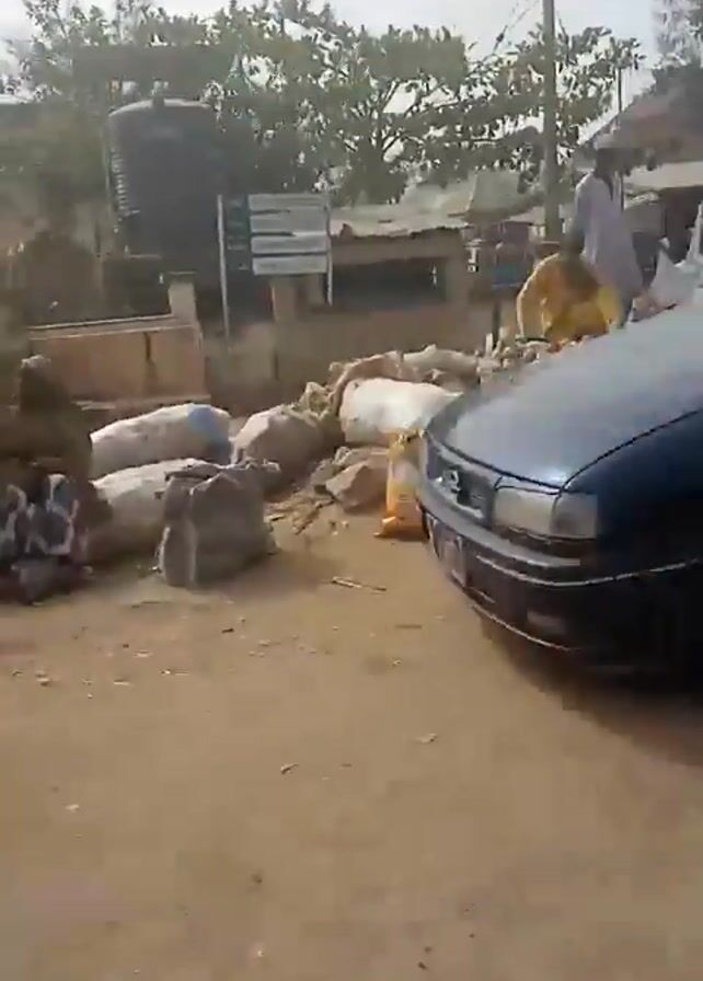scene of a bustling outdoor market in a rural area. The ground is sandy and dusty. In the first few shots, we see a dark-colored car parked, and then driving slowly. People are seen milling about, some wearing traditional clothing. There are large piles of what appears to be produce, like potatoes or yams, in buckets and sacks. A security guard is visible in the crowd. Later, a large blue MAN truck passes by. The overall atmosphere suggests a typical market day in a small town.