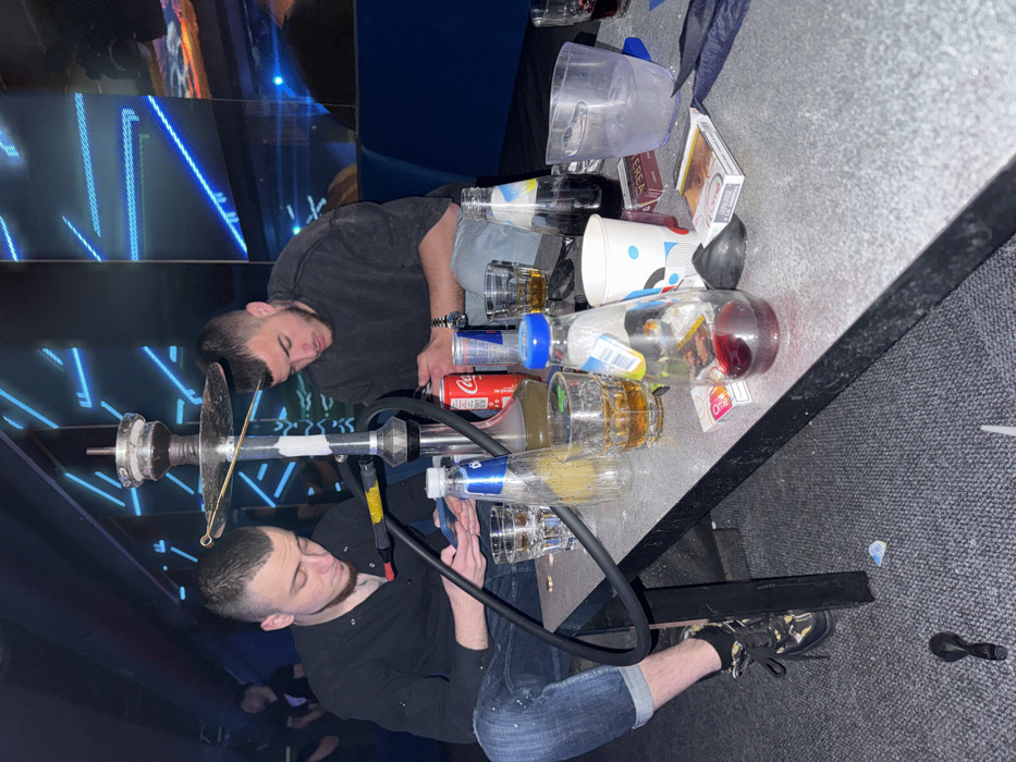 The scene depicts two males seated at a table within a dimly lit indoor establishment in Sliven, Bulgaria, characterized by a contemporary lounge or club aesthetic. Both individuals possess short, dark hair and are focused on their respective smartphones. The male on the left wears a dark long-sleeved collared shirt, blue jeans with white paint-like splatters, dark socks, and dark sneakers with yellow patterns. His right hand holds a smartphone, while his left hand rests on his left thigh. A black hookah hose is draped across his lap and the table. The male on the right has short, dark hair and light facial stubble, wearing a dark short-sleeved t-shirt and light blue jeans. He is also looking down at a smartphone held in his left hand, and a watch is visible on his left wrist. A metallic hookah pipe with a black hose is centrally positioned on the table between the two males. The table surface is grey and rectangular, laden with various items: * Multiple clear glass tumblers, several containing amber liquid. * Several plastic bottles, some containing clear liquid, one with a reddish liquid. * A red Coca-Cola can and a silver energy drink can. * Two white cigarette packs (brands "Opal" and "Roma" are visible). * A clear plastic ice bucket with ice. * A white paper cup with a colorful design. * A pair of dark sunglasses. * A black, irregularly shaped object, possibly a lighter or discarded item. The background features dark blue upholstered booth seating. Behind the right male, a wall is adorned with horizontal and vertical blue linear LED lights, creating a geometric pattern. The overall lighting is low, with the blue illumination providing a significant visual element. The floor is covered with a dark grey, patterned carpet.