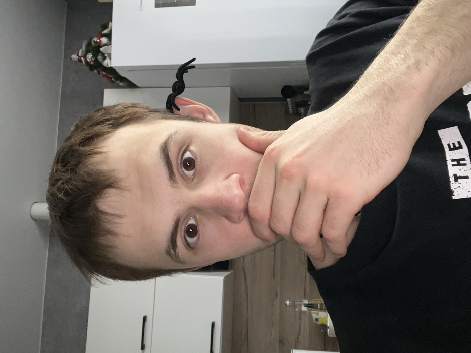 A male individual, appearing to be in his twenties, with short brown hair and wide-set brown eyes, is depicted in a medium close-up shot within a domestic indoor setting, stated to be the city of Tlustenkhabl, Russia. He is wearing a black t-shirt with white text partially visible on the lower portion of his chest. His right hand covers his mouth and chin, with fingers pressed against his lips and the thumb resting along his jawline. His eyes are wide open and directed towards the camera. A black, eight-legged artificial spider is positioned on the upper helix of his right ear. The background on the left features white kitchen cabinetry with black horizontal handles, situated above a wooden countertop where a glass bottle and other items are visible. On the right, a large white refrigerator is present, topped with a small, decorated artificial Christmas tree. The scene is brightly and evenly lit.