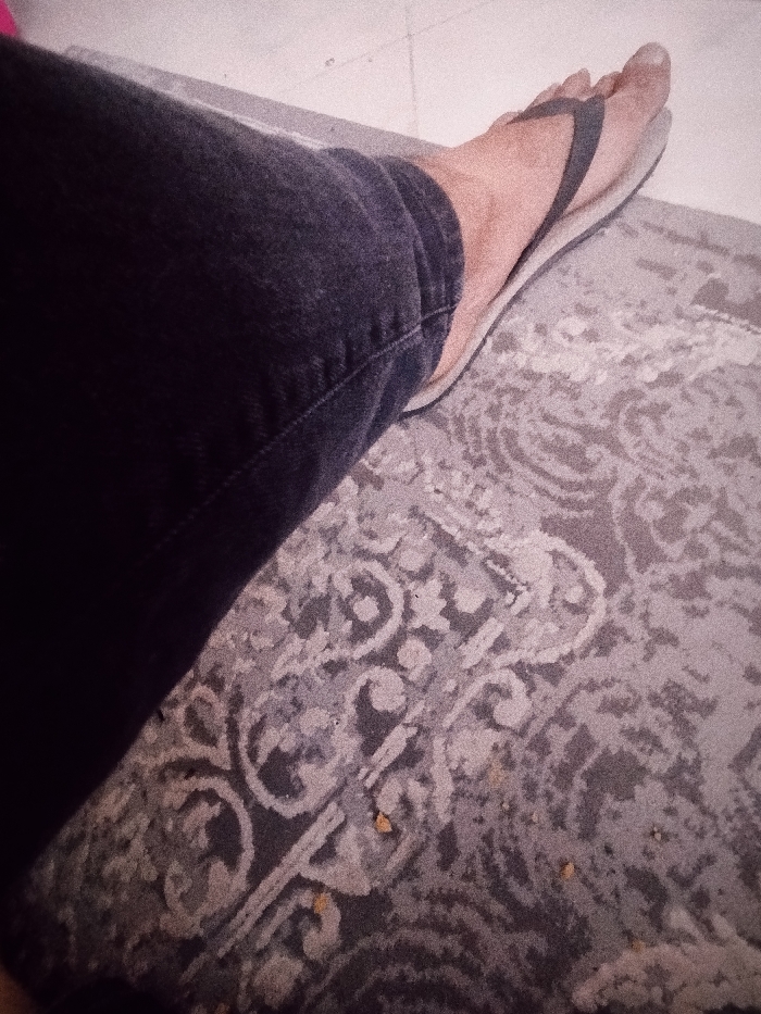 The image presents a close-up, high-angle view of an indoor setting in Parand, Iran. A lower leg, clad in dark, faded denim trousers with visible seams and folds, occupies the left side of the frame. A bare, light-skinned foot is positioned within a dark-strapped flip-flop, which features a light-colored sole. The foot and trouser leg are situated above a grey floor covering identified as a rug or carpet, displaying an ornate, repeating pattern of lighter grey curvilinear and floral motifs against a darker grey base. Several small, irregular yellowish-brown particles, consistent with crumbs or organic debris, are scattered on the rug, primarily in the lower right portion. A plain, light-toned surface, likely a tiled floor or wall, is visible in the upper right background, beyond the rug. The lighting is ambient, and the image exhibits a slight visual noise or grain.