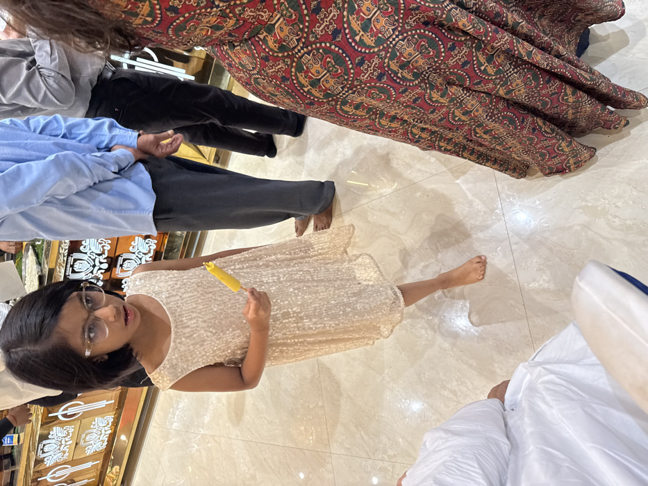 A young girl in a sparkling dress and glasses holds a yellow popsicle. She stands barefoot on a light, tiled floor. The lower portion of a person in a long, patterned dress is visible above her. To the left, a man in a blue shirt and dark pants stands near a glass display case. To the right, part of a person in white clothing is seen.