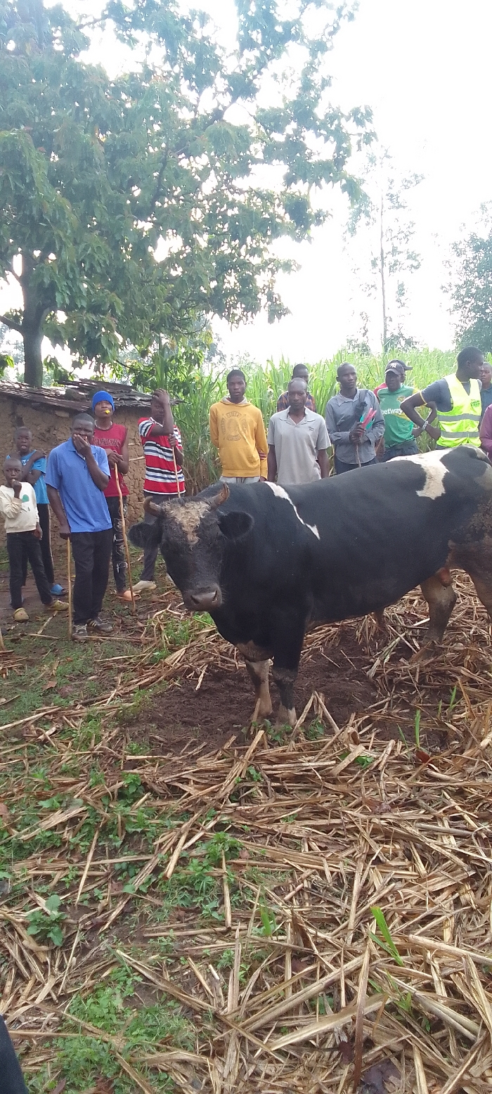 black and white bull standing on a field of brown grass. The bull is in the center of the frame, facing the camera. There are 10 people standing behind the bull, all facing the camera. Most are holding sticks. The people are wearing a variety of clothing, including casual clothes, and one person wearing a bright green shirt with a red cap. The bull is in a field with many brown, dry stalks of grass. There is a clay-colored building in the background. The coordinates place the location in the rural area of Burundu, Kenya, near a river. The field of dry stalks is likely sugarcane. The bull is likely being prepared for a local market.