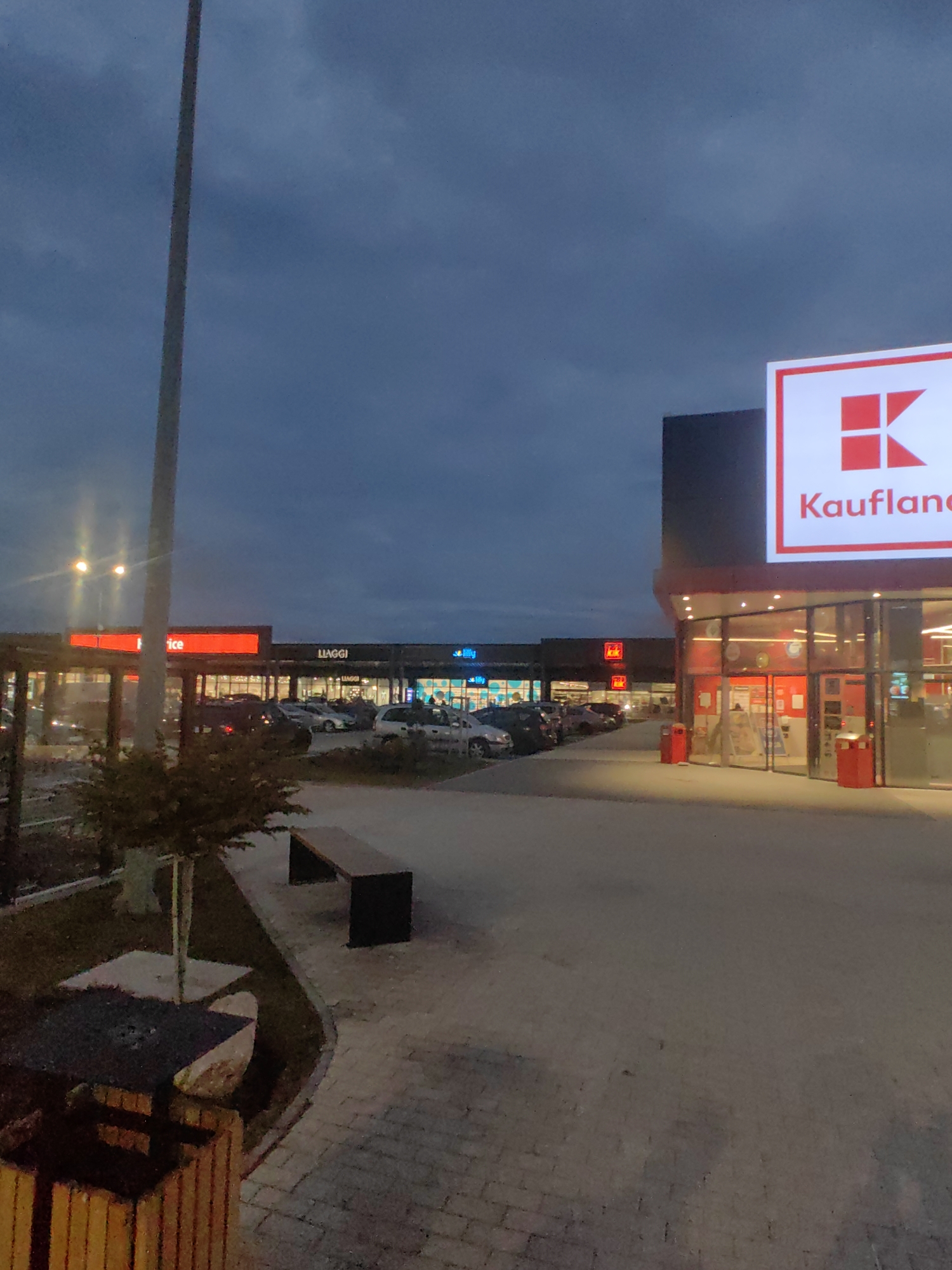 exterior of a Kaufland store and a shopping complex in Sofia, Bulgaria. The sky is overcast. A tall lamppost is on the left side of the image. A tree and a bench are visible near the lamppost. Numerous parked cars fill the parking lot in front of the shopping complex. In the background, storefronts like "LUAGGI" and "lilly" are illuminated. The Kaufland sign is prominently displayed. Red trash cans stand near the entrance. The ground is paved.