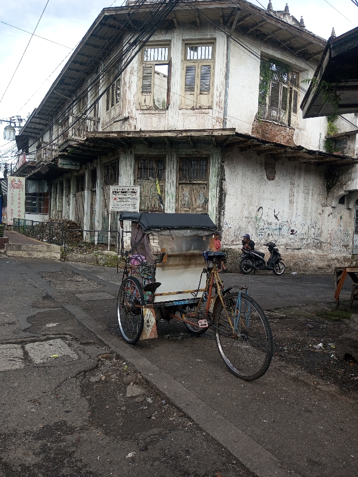 A dilapidated two-story building with peeling white paint stands on a corner. Windows are boarded or shuttered. An old trishaw occupies the foreground on an asphalt road, displaying signs of age and use. A motorcycle is parked nearby, with two people standing close to it. The setting evokes a sense of urban decay and historical neglect.