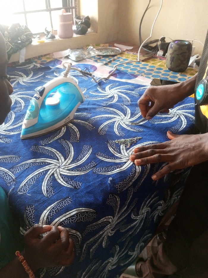 Two people are working on a blue patterned fabric. One person is using tweezers to attach embellishments while the other observes. An iron sits on the fabric near the person with the tweezers. On a table in the background are a window, a water bottle, decorative objects, embellishments, and an electronic device.