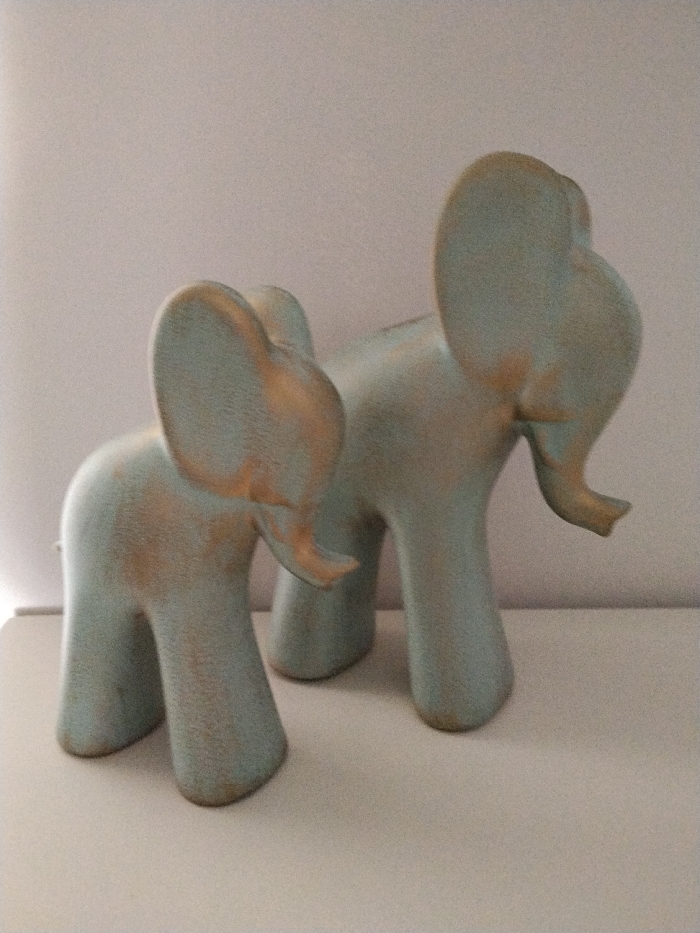 The image depicts two stylized elephant figurines, located in Vila Real, Portugal. The figurines are primarily light blue-green or teal in color, with irregular, textured patches of a metallic golden or bronze hue, particularly visible on their ears, trunks, and legs. They stand on a flat, white surface, against a plain, light-toned background, likely a wall. The elephant in the foreground is positioned slightly to the left and appears marginally closer, while the second elephant is behind and to the right, mostly visible from its torso, legs, large ears, and trunk. Both figures have exaggerated, upward-curving trunks and large, rounded ears, conveying an artistic or decorative aesthetic. The lighting is soft and even, producing minimal shadows. No people or specific actions are depicted.
