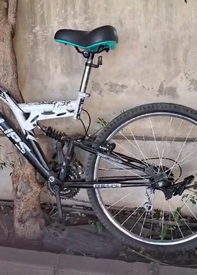 black and white Phillips mountain bike propped against a tree next to a concrete wall. The bike has a teal seat and a full suspension frame. There is greenery growing nearby.