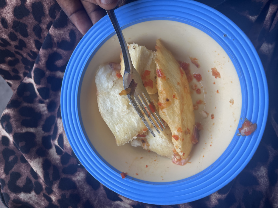 An overhead, close-up image captures a meal served in a round, light-yellow bowl with a ribbed blue rim. The bowl contains several irregular, light-brown pieces of fried yam, generously coated with a red, chunky sauce containing visible red fragments and oil. A silver-colored metal fork is inserted into one of the yam pieces on the right side of the bowl, held by a dark-skinned hand, indicating active consumption. A dark brown and black leopard print fabric forms the background. The scene is located in Onitsha, Nigeria.