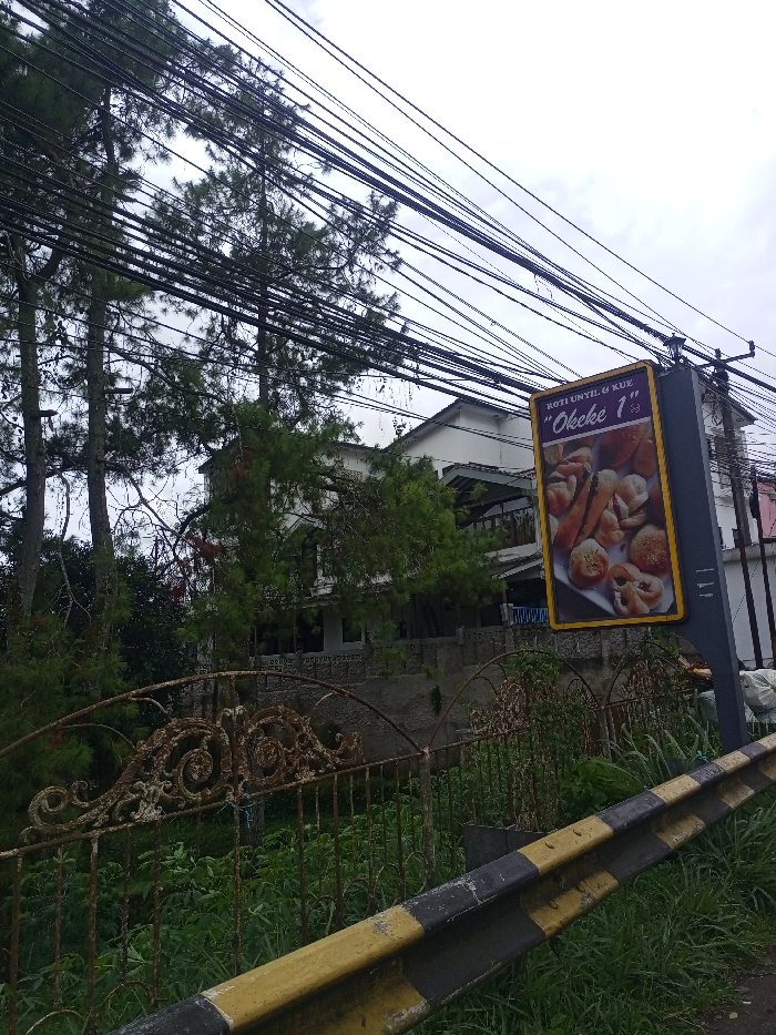 This image depicts a roadside scene in Meyong, India, under an overcast sky. In the immediate foreground, a black and yellow striped metal guardrail extends diagonally from the lower right. Behind it, wild green grass and weeds grow. A heavily rusted, ornate wrought-iron fence runs horizontally across the mid-ground, featuring intricate scrollwork. Behind the fence, dense green vegetation, including several tall, slender evergreen trees, partially obscures a multi-story white building with a dark roof. To the right of the fence, a vertical freestanding sign with a yellow border displays text "ROTI UNYIL & KUE" and "Okeeke 1"" above an image of various baked goods. Numerous dark utility wires crisscross the upper portion of the image, interwoven with the branches of the tall trees. No individuals are present in the scene.