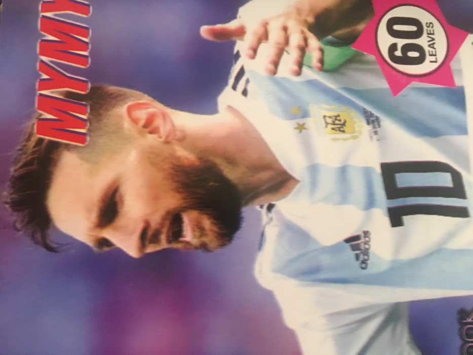 A photograph captures a printed commercial cover, likely for a notebook, featuring a male individual identified as Lionel Messi