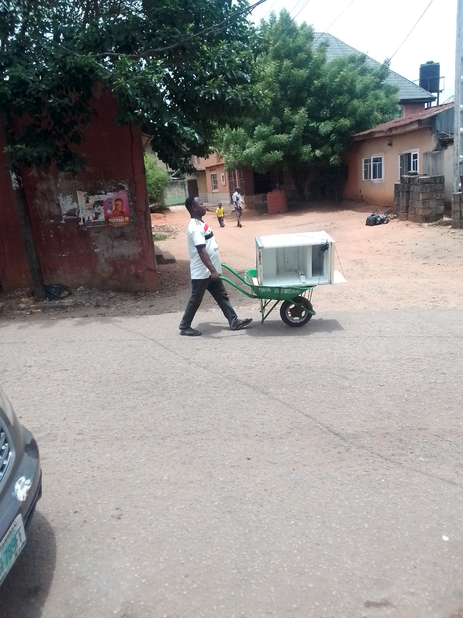 A man is walking down a street in Onitsha, Nigeria, pulling a wheelbarrow. The wheelbarrow contains the interior of a refrigerator. The street is paved but shows signs of wear. There are buildings and trees on either side of the street. Other individuals are visible in the background. Part of a vehicle is in the lower left corner of the frame. A poster is affixed to the side of a building.