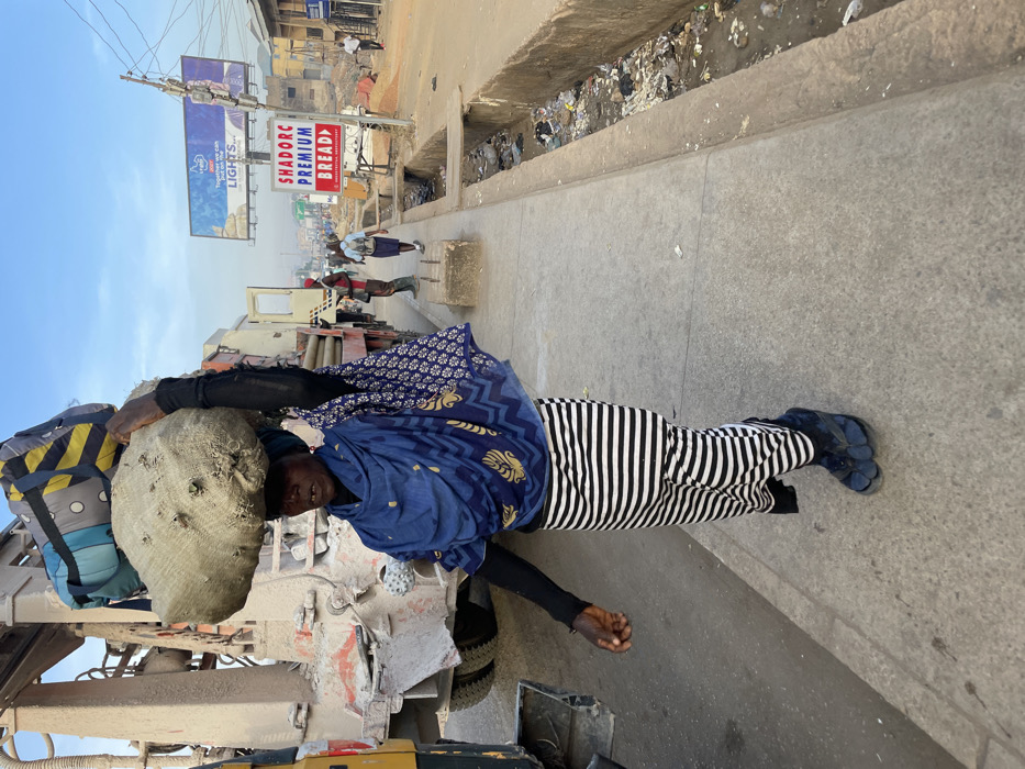 The image captures an urban street scene in Jos, Nigeria, featuring a pedestrian and street infrastructure under a hazy sky. In the foreground, an adult female with dark skin walks rightward on a grey concrete sidewalk, carrying a large, light-brown, possibly burlap, sack on her head, topped by a blue, yellow, and black striped bag. Her right arm is raised to support the headload, while her left arm hangs slightly bent. She is dressed in a black long-sleeved top under a blue wrap with gold-colored patterns, a black and white horizontal striped ankle-length skirt, and dark blue sandals. To her immediate right, an open concrete drainage ditch runs parallel to the sidewalk, containing visible refuse such as plastic bags and debris. Beyond the ditch is an unpaved road. In the mid-ground, other individuals are visible; one person in a light top and dark pants walks away on the sidewalk, and another, wearing green boots, stands near a vehicle on the road. To the left of the main subject, a large, light-colored heavy-duty vehicle, possibly a drilling rig or construction truck, is partially visible, showing signs of dust and residue. In the background, a large blue billboard with white text "Together we can power our lives. LIGHTS." is prominent. Below it, a red and white sign on a pole reads "SHADORC PREMIUM BREAD," with smaller print including a phone number. Low-rise buildings line the far side of the road, and utility poles with overhead wires are present. The overall lighting suggests either morning or late afternoon.