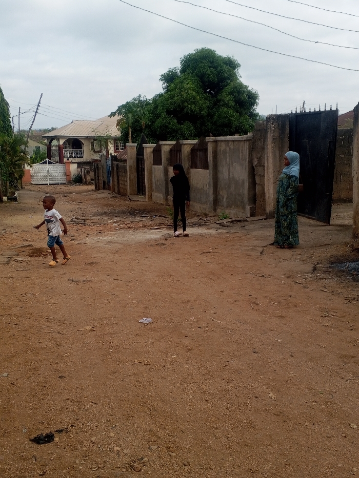 A dusty street scene features three children. A young boy in a white t-shirt and blue shorts walks along the left side. A taller girl in a black outfit stands near a concrete wall. To the right, a girl wearing a long patterned dress and a light blue headscarf stands by an open metal gate. A building with a light-colored roof is visible in the background. The sky is overcast, and power lines stretch overhead.