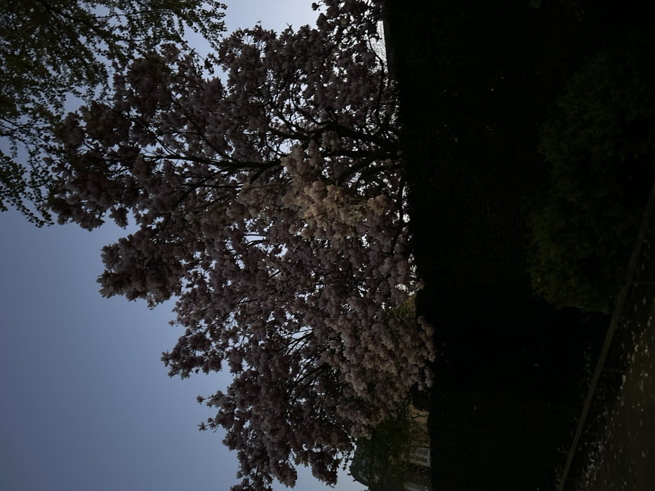 The scene captures an outdoor environment in Venlo, Netherlands, during twilight or dusk. A large deciduous tree, likely a magnolia, is prominently displayed in the upper and central areas, adorned with numerous light pink or white blossoms. Its branches are dark, silhouetted against a gradient sky that transitions from a light blue horizon to a darker shade above. Below the blooming tree, a dense, dark green hedge spans horizontally across the image, marking a boundary. To the far left, partially visible behind the tree, is a section of a light-colored building featuring a pitched roof and a single window with closed shutters. The foreground consists of a dark, paved surface, possibly a sidewalk or path, on which numerous light-colored petals are scattered. A slender, dark horizontal bar or railing is visible along the lower left edge of this paved area. No individuals, animals, or vehicles are present.