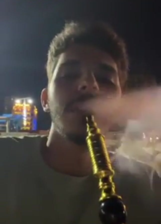 A young man with short, dark hair and a dark mustache is shown at night, smoking a hookah with a gold-colored stem and a black mouthpiece