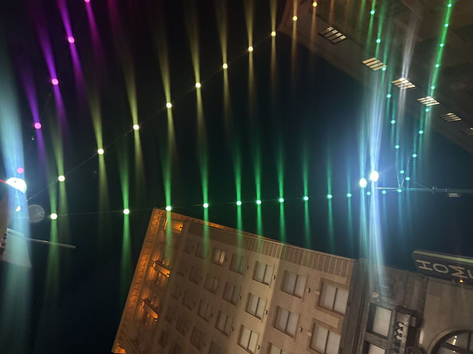 An upward-angled nighttime photograph depicts an urban environment in San Antonio, Texas, United States. The scene is dominated by multiple strands of multicolored string lights suspended overhead against a dark sky. These lights emit prominent radial lens flares, appearing primarily as green, yellow, and magenta/purple horizontal bands originating from individual bulbs. To the left, a multi-story building constructed of light-brown masonry features numerous uniformly spaced rectangular windows. Its upper portion is adorned with decorative architectural elements, illuminated by an orange-yellow light. A vertical sign displaying the partial word "HOME" is visible on the lower section of this building. A second, darker-colored building with visible windows appears on the right side of the frame. A bright, blue-white light source, likely a streetlamp, is visible towards the lower center. No individuals, vehicles, or explicit actions are present.