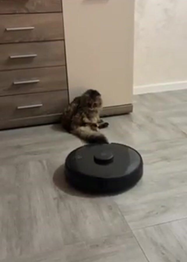 The scene shows a gray, wood-look tile floor in a room with furniture. A dark gray robotic vacuum cleaner moves across the floor. A medium-sized, brown, long-haired cat sits on the floor next to a light-colored cabinet. The cat is sitting in a slightly hunched posture. The robotic vacuum is moving independently in the room.