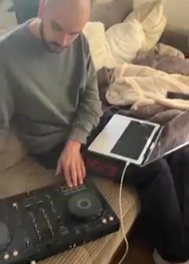 A man sits on a grey sofa, operating a Pioneer DJ controller connected to a laptop