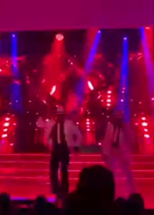 The video captures a live stage performance by a group of five musicians and dancers in front of an audience. The performers are dressed in white or black suits with hats and are singing and dancing in sync. The stage is lit with red and blue spotlights, creating a vibrant and energetic atmosphere. Behind the performers, a large screen displays dynamic patterns and visuals, adding to the visual spectacle of the performance. The audience is visible in the foreground, and they appear to be enjoying the show.