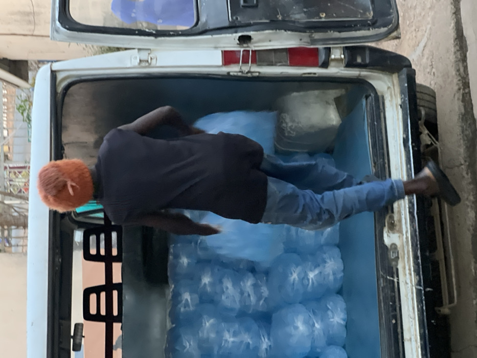 In Jos, Nigeria, a person is depicted stepping into the rear cargo area of a white commercial van. The individual, seen from behind, wears a dark, short-sleeved top, light blue jeans, black slide sandals, and a reddish-orange furry cap with a small light-colored bow on the back. Their left foot is inside the van, and their right foot is descending towards a light-colored ground surface, suggesting movement either into or out of the vehicle. The van's rear tailgate is open, revealing its interior, which is lined with a light blue material. This cargo space is densely packed with numerous transparent plastic bags, each containing a clear liquid, likely sachet water. These bags are stacked in organized rows, filling a significant portion of the visible storage area. The van's rear right passenger door is also ajar. Through the front windshield, the upper portions of two dark, rectangular seatbacks or headrests are visible. The surrounding environment includes parts of light-colored building structures and minimal, indistinct greenery in the background, under ambient daylight.