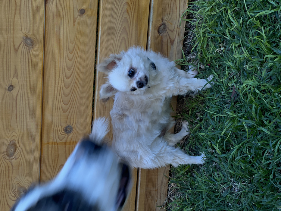 The image depicts an outdoor scene in Herzliya, Israel. A small, long-haired, cream-colored dog, resembling a Chihuahua, stands on green grass in the center-right of the frame, facing slightly right but looking left with a wary or startled expression. Its dark eyes are prominent, and its mouth is slightly open, revealing a portion of its teeth. It wears a dark-colored collar. In the blurred foreground on the left, the head and neck of a larger, black and white dog are visible, appearing to approach or sniff the smaller dog. Behind the dogs, a light brown wooden fence with horizontal planks and visible grain extends across the upper half of the image.