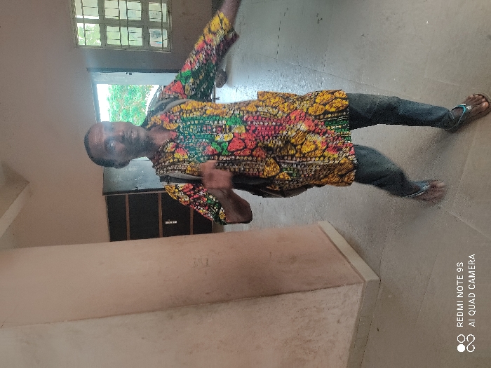 A man in a colorful patterned shirt and jeans stands diagonally in a room with light tan walls and flooring. He is wearing sandals and has one arm raised. A window is visible in the background, and a dark cabinet stands against the wall. The room has a minimalist feel with neutral tones. The image seems to be a snapshot of a casual moment.