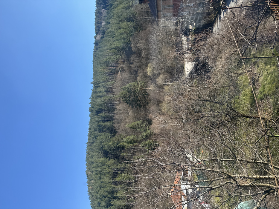 This image depicts a wide exterior view of a village landscape, identified as Slokoshtitsa, Bulgaria, against a backdrop of a forested mountain under a clear blue sky. The upper half of the frame is dominated by a clear, unclouded blue sky, transitioning downwards to a large, prominent mountain. The mountain is heavily covered with dense coniferous forest, characterized by tall, slender evergreen trees. In certain sections of the mountain slope, particularly mid-level, patches of deciduous trees are visible, appearing bare with light brown and grey branches, indicating a late winter or early spring season. The middle and lower portions of the image showcase the village environment. Numerous bare deciduous trees with intricate branch networks occupy the mid-ground and foreground, largely obscuring direct views of the ground level. Patches of green vegetation, possibly grass or early spring growth, are visible between these trees and on the slopes. On the left side of the lower frame, parts of village structures are visible, including the orange-red tiled roof of a building. On the far right, a two-story building with a visible red tiled roof and a brick chimney is partially obscured by trees and shadows. A narrow, dark asphalt road or path is discernible weaving through the lower mid-ground, with utility poles and wires present in the vicinity. There are no individuals, active subjects, or discernible interactions within the captured scene. The overall lighting suggests bright daylight conditions.
