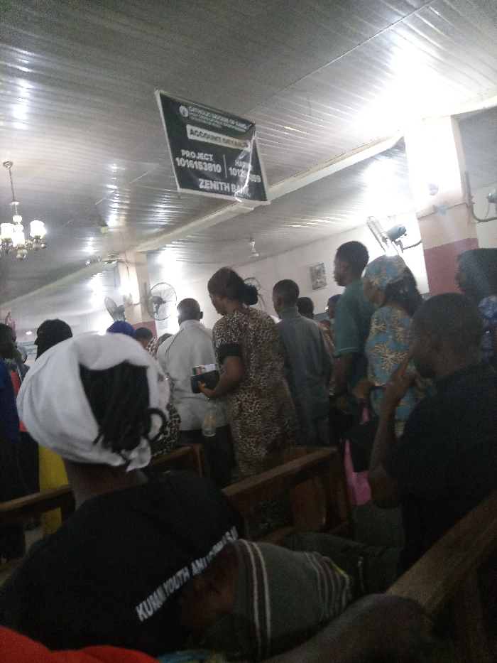 Inside a building with a high ceiling and fluorescent lighting, a crowd is gathered. A banner displays bank account details, advertising "Catholic Diocese of Yango." People are dressed in various attire; one wears a leopard print dress and another a blue patterned top. A person in the foreground is wearing a black shirt with "KUMASI YOUTH AMBASSADORS" printed on it. There are pews present, indicating the space may be a church or place of worship.