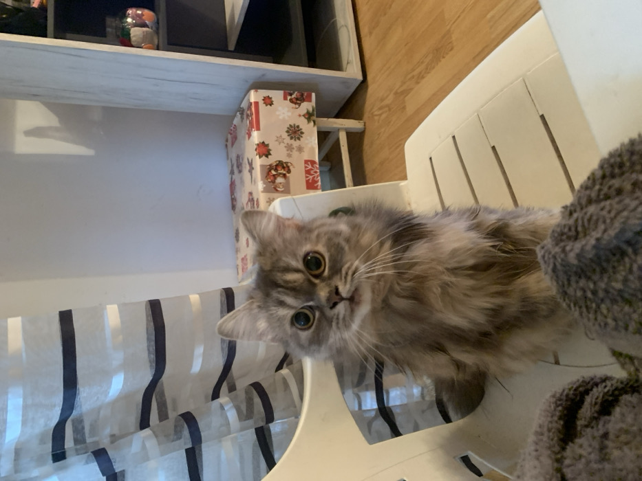 - "A long-haired grey tabby cat, exhibiting prominent green-gold eyes and an attentive posture, is depicted seated on a white slatted plastic chair in an indoor domestic environment" by FM-Etrm53, licensed under CC BY 4.0