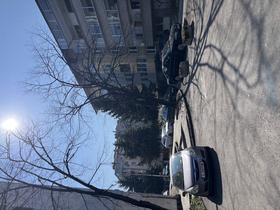This image depicts a sunny street scene in Burgas, Bulgaria, identifiable by the "A" prefix on the license plate of the foreground vehicle. The scene features a paved urban area with multiple parked vehicles, several buildings, and trees under a clear blue sky. In the immediate foreground, a light grey Opel Corsa, bearing Bulgarian license plate A 8409 MK, is parked facing the viewer. To the right, a dark blue/black Audi sedan is parked adjacent to the curb. Further back, additional parked cars are visible, including a white sedan and several other dark-colored vehicles. The ground consists primarily of asphalt, with some raised concrete sidewalk sections and two low, circular concrete planters containing dormant vegetation. Numerous trees are present; several deciduous trees with bare branches are prominent, casting long, distinct shadows across the asphalt, suggesting a low sun angle (likely morning or late afternoon). Behind the vehicles and trees, multi-story residential buildings are visible. The most prominent building on the right features multiple windows and enclosed balconies. No individuals are visible, and no actions or interactions are depicted. The overall impression is that of a quiet residential street or courtyard area on a bright day.