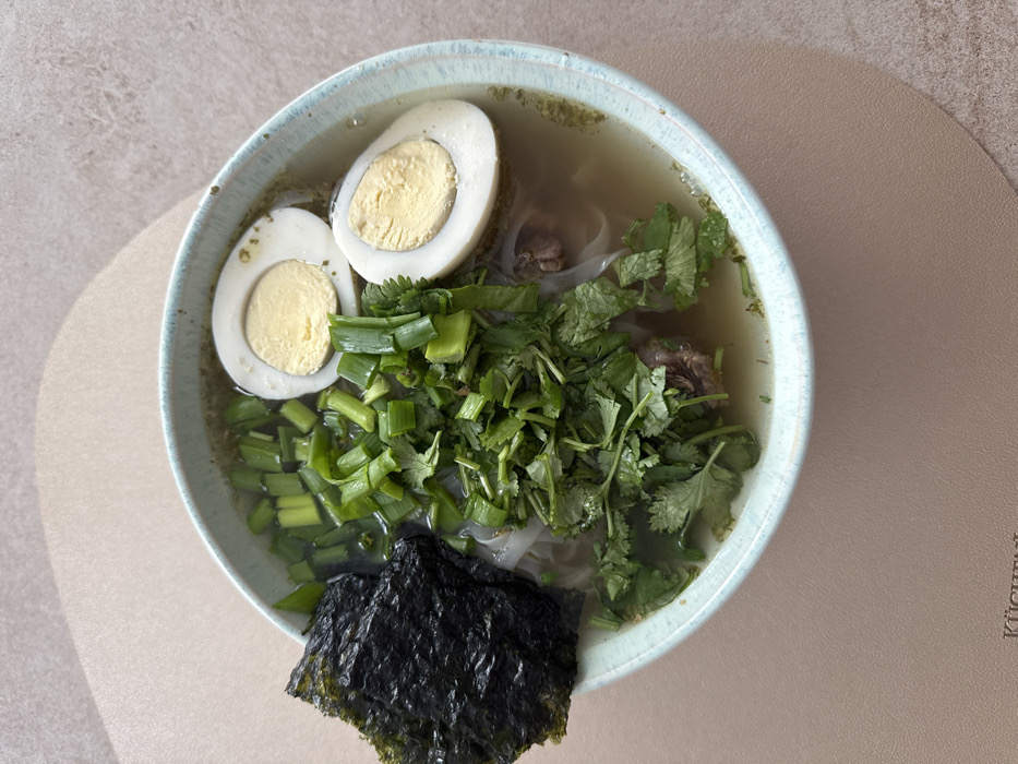 - "A light blue ceramic bowl containing a noodle soup is centered on a light beige circular placemat" by FM-GBY8N2, licensed under CC BY 4.0