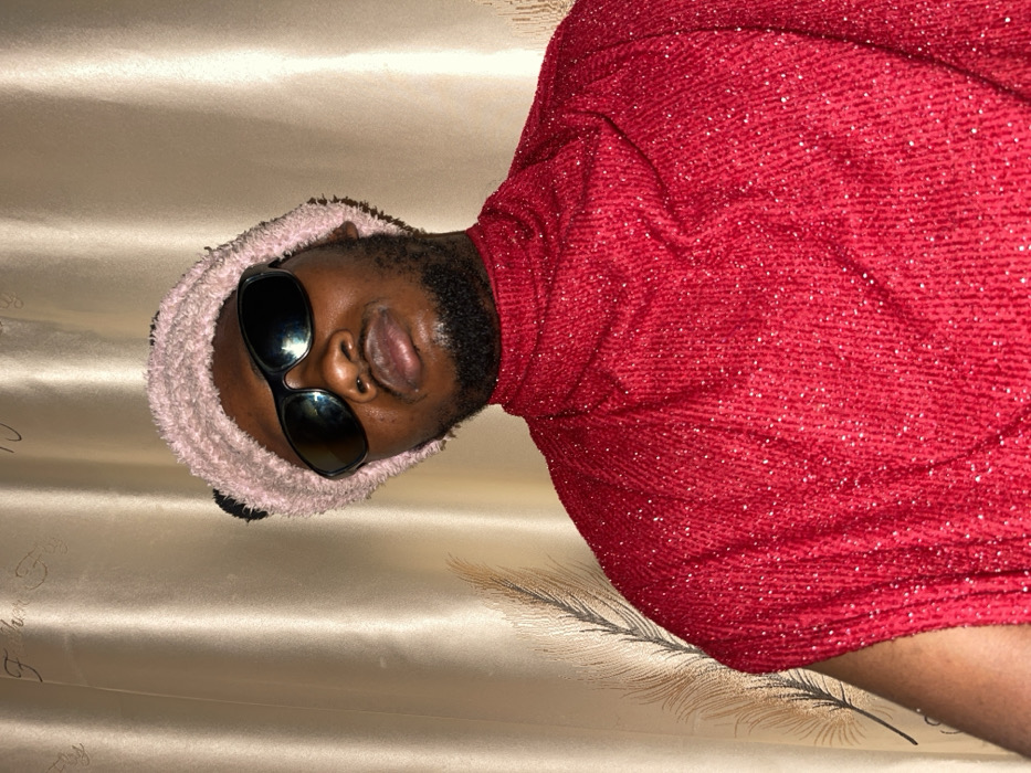 A person with dark skin and a beard is wearing sunglasses and a fluffy pink hat with black accents. The person is lying on a cream-colored, patterned surface with a decorative feather. The individual is wearing a shimmering red turtleneck shirt. The picture is rotated 90 degrees counterclockwise.