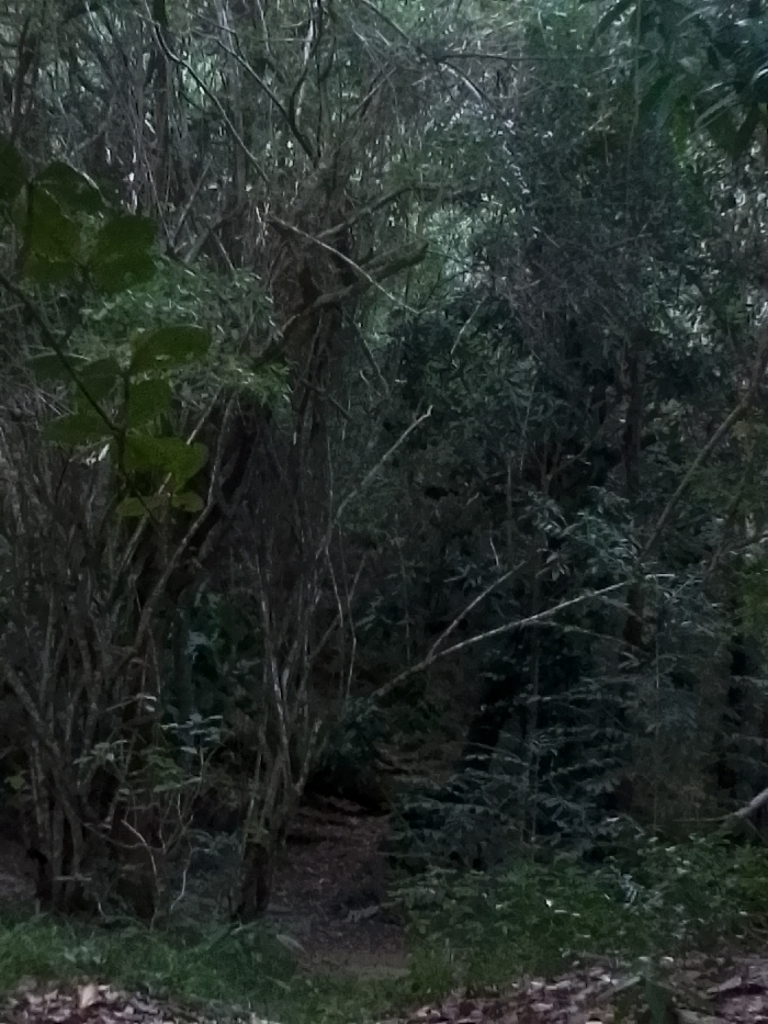 The image presents a dense, overgrown natural environment located in Las Piedras, Venezuela. The scene is characterized by a multitude of trees, shrubs, and interwoven branches, creating a thick, natural barrier. The foliage is primarily dark green, with numerous bare, thin, and tangled branches visible throughout the frame. The lighting appears dim and diffused, indicative of a heavily shaded area or low light conditions. The ground in the foreground consists of sparse green vegetation and a layer of fallen leaves. A subtle, narrow depression or path is discernible at the bottom center, extending into the dense undergrowth. No individuals, animals, or man-made objects are present. No actions or interactions are depicted.