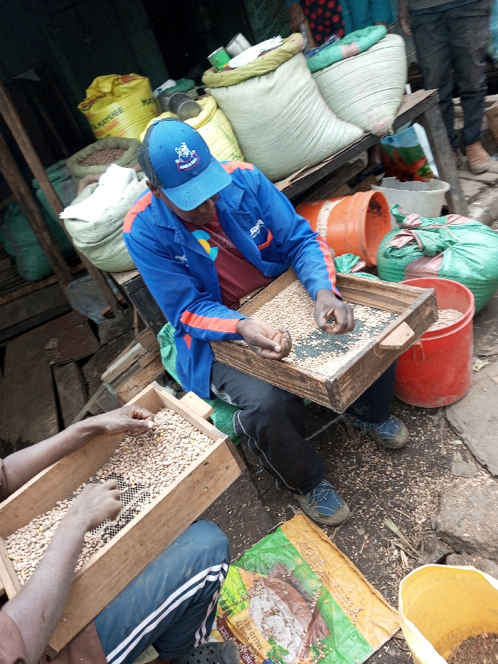 The image depicts two individuals engaged in manual sorting of grains or beans within what appears to be an outdoor or semi-outdoor market stall in Nairobi, Kenya