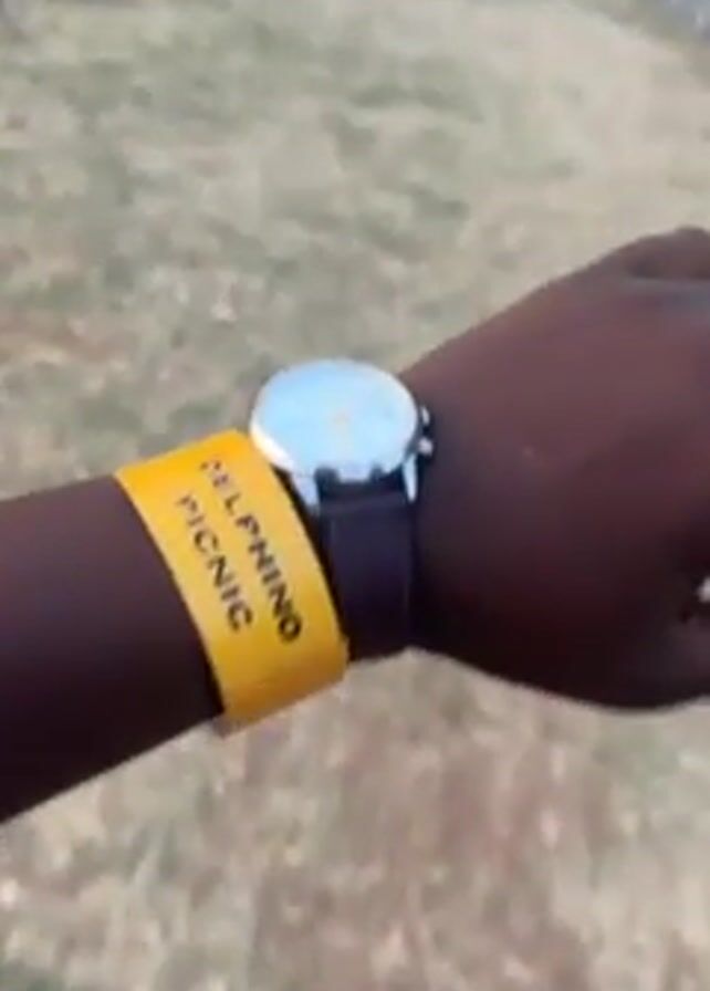 A dark-skinned person's left wrist is visible, with a watch and a yellow wristband that reads "DELPHINO PICNIC". The watch has a silver casing and a dark brown leather strap. The person appears to be standing outdoors, likely on grass or a field. The background is blurred, suggesting movement.