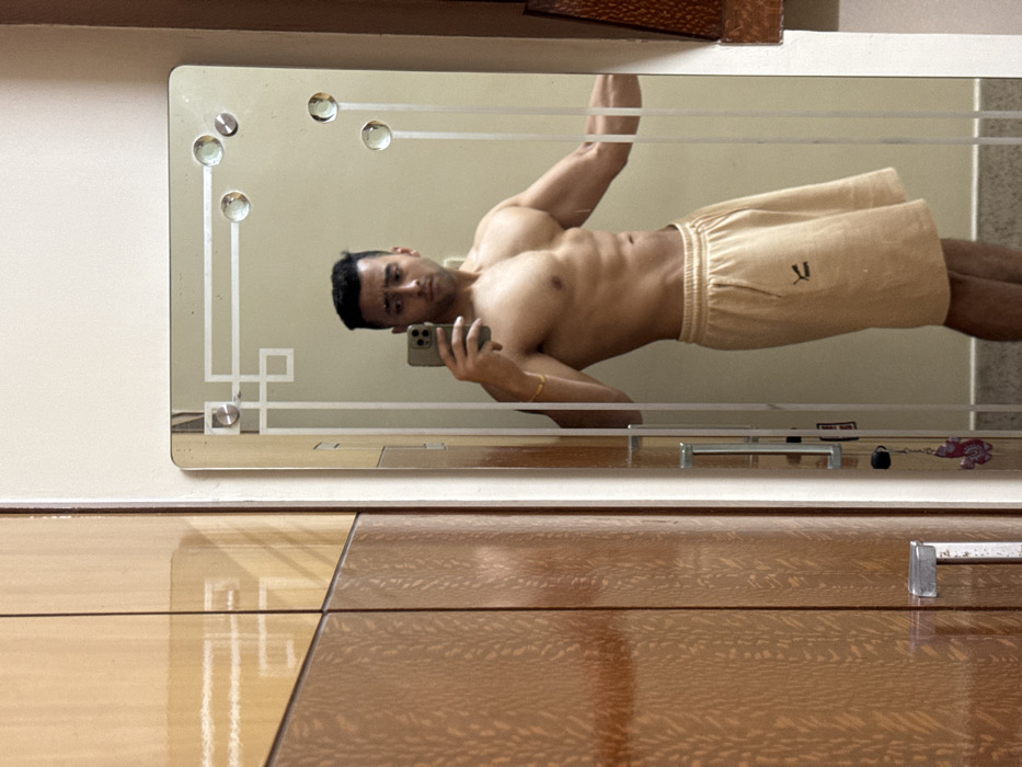 A man is reflected in a mirror, posing shirtless in light-colored shorts