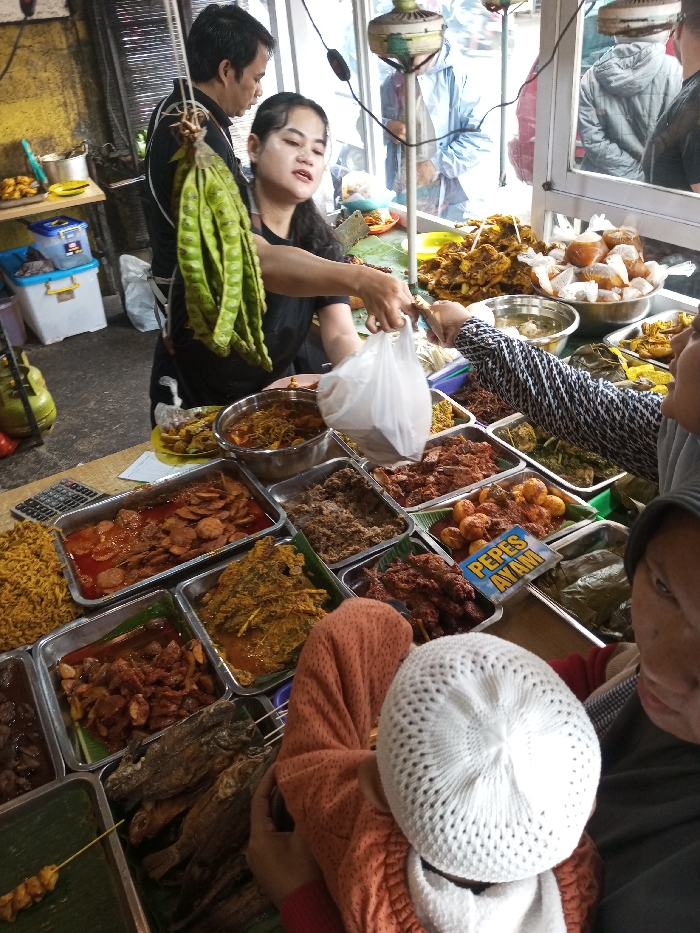 This image depicts a bustling street food stall scene in Melakudikadu, India. A female vendor, wearing a black shirt, is observed in the foreground, extending her right hand to pass a white plastic bag containing food to the outstretched hand of a customer, visible on the right. Her left hand holds additional food items or utensils. Behind her, a male vendor in a black shirt is partially visible, facing away. To the left of the female vendor, several bunches of large, green, elongated pods, identified as petai (stink beans), hang from a suspension point. The stall itself is filled with a diverse array of prepared dishes, presented in numerous rectangular metal trays across a counter covered with banana leaves. Visible dishes include various meat and vegetable curries, fried fish, skewered items, boiled eggs in red sauce, and crispy yellow noodles. One blue sign, visible in the lower right quadrant, clearly displays "PEPES AYAM" (Chicken Pepes). In the background, behind the vendors, a glass or clear plastic barrier separates the stall from an outdoor area where blurred figures, some appearing to wear raincoats, are present. On the far left, a green gas cylinder and stacked plastic containers are visible. A customer, partially seen from the upper body and head in the lower right, wears a white crocheted kufi cap and a peach-colored garment, looking towards the stall's offerings. The overall setting appears busy and commercially active, likely within a market or roadside environment.