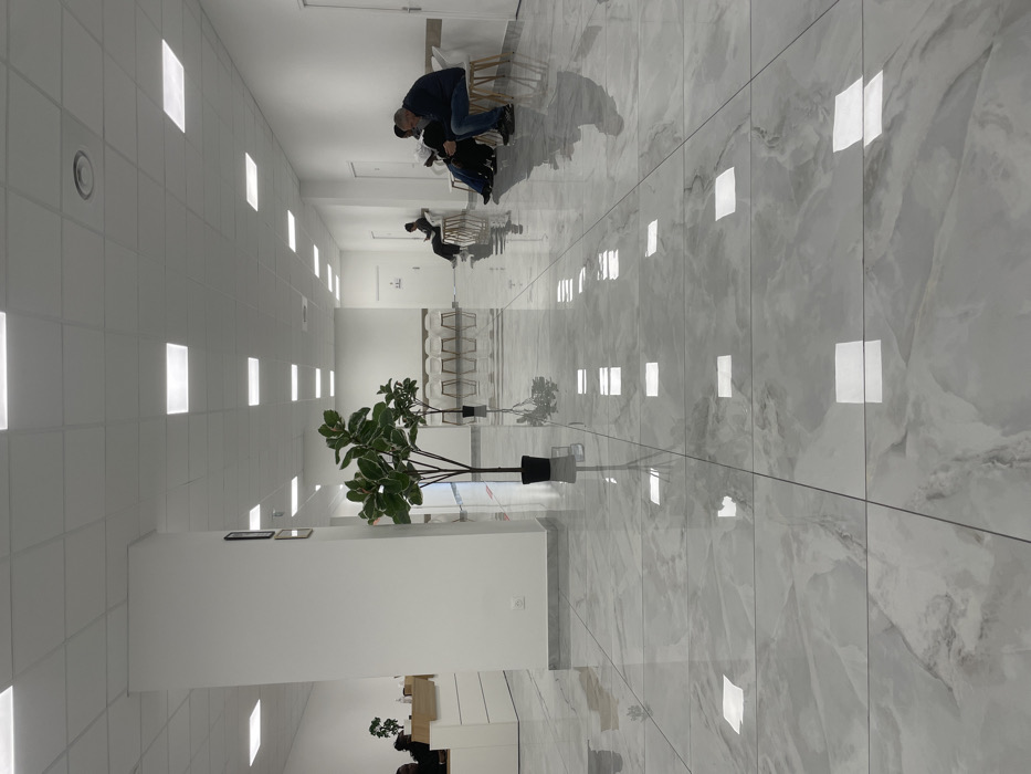This image depicts a brightly lit, modern waiting area or public reception space in Plaisir, France. The environment features a highly reflective, polished grey and white marble-patterned tiled floor, which prominently reflects the numerous square recessed LED ceiling lights and objects within the scene. The walls are uniformly white, with a white grid panel ceiling. In the foreground and midground, two artificial trees in black pots are positioned, creating reflections on the floor. To the left, a white rectangular pillar stands, and beyond it, a reception desk with a light wooden counter is visible, behind which a person is partially seated, facing towards the left. Along the right side of the image, a row of white chairs with wooden legs is arranged against the wall. Four individuals are seated in this area: one man in a dark jacket and blue jeans looks downwards, another person is partially obscured beside him, a third person further down is engrossed with a mobile phone, and a fourth person is seated beyond them. Further down a central corridor, additional rows of white chairs are visible, along with multiple white doors lining the walls. The overall impression is one of cleanliness and functional design within a public service or medical facility.