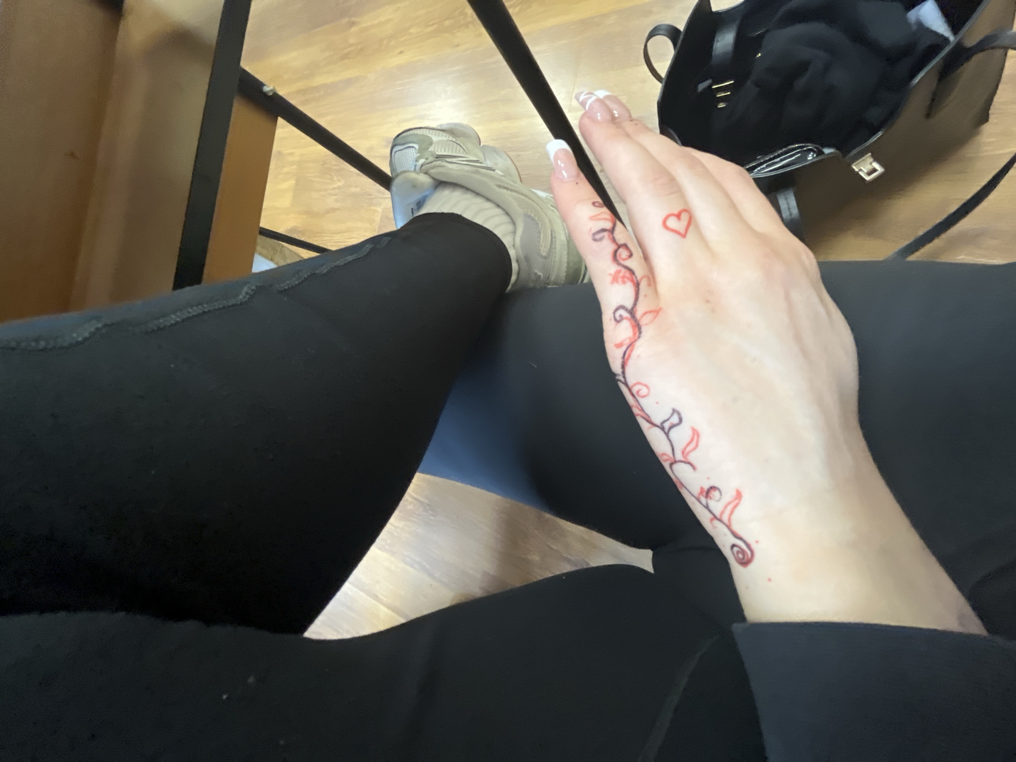 first-person view of a person seated in what appears to be an indoor setting, likely a home or office. The person is wearing black leggings and light-colored sneakers with white socks. A black bag is visible in the upper right corner of the frame. The person's right hand, adorned with a temporary tattoo of a vine and a heart, rests on their leg. The floor is made of wood. The presence or absence of details relating to the city of Ruse, Bulgaria is indiscernible as there is no information or visual cues that relate to this city.