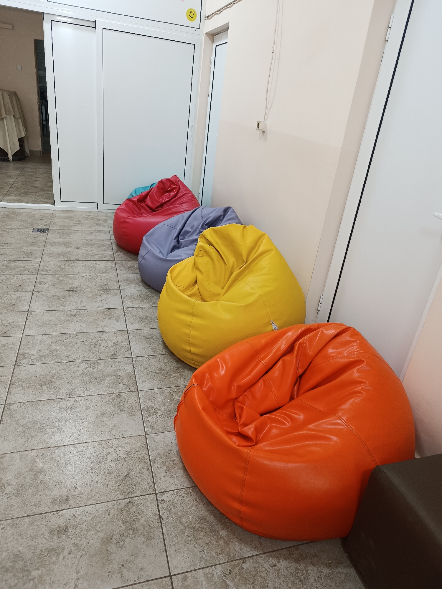 Four beanbag chairs of varying colors (red, grey, yellow, and orange) are arranged in a row on a tiled floor against a pale wall