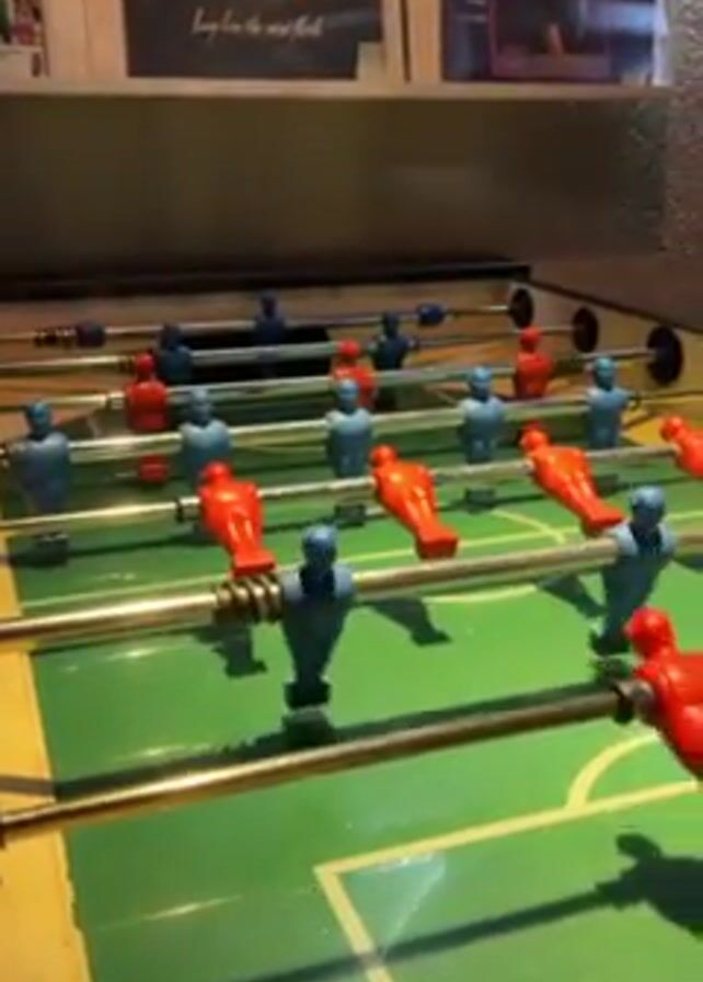close-up of a foosball table. The table is green with white lines mimicking a soccer field. The teams are red and blue, with the players attached to metal rods that run horizontally across the table. Someone is actively playing the game, rapidly spinning the rods, causing the foosball players to move and strike at an unseen ball. Above the table, on the wall, are framed posters.