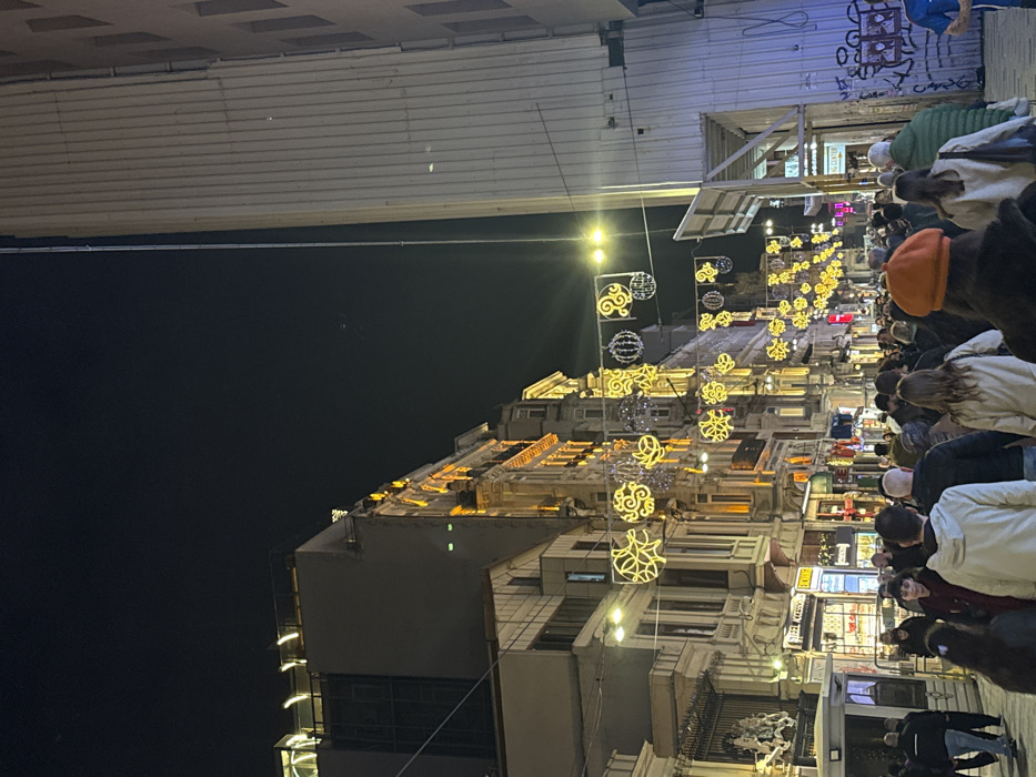 A nighttime urban scene shows a crowded street illuminated by decorative lights strung overhead