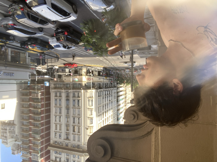A man faces upwards, holding a glass of coffee and a cigarette against a blurred urban backdrop. Outside, cars populate a street, bordered by tall buildings. One building has a sign that says "Z-FEIC." The image is inverted, with the street oriented upwards. The man has tattoos on his chest. The light is very bright.