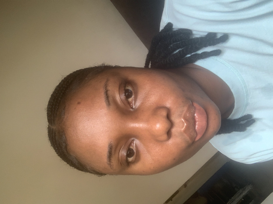 A close-up, frontal portrait image captures a single individual, identified as a young adult female of Black ethnicity, indoors