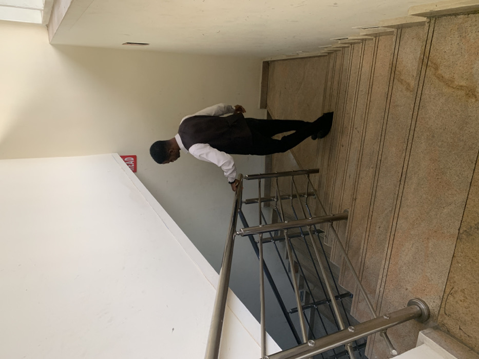 A man in a white shirt and black vest, coupled with black pants and shoes, leans on a silver metal railing on a staircase. The staircase features marble-like steps and a white wall on the left with a red sign. The camera angle is from above, capturing the man in a somewhat awkward, off-balance pose on the landing. He is looking down the stairs.
