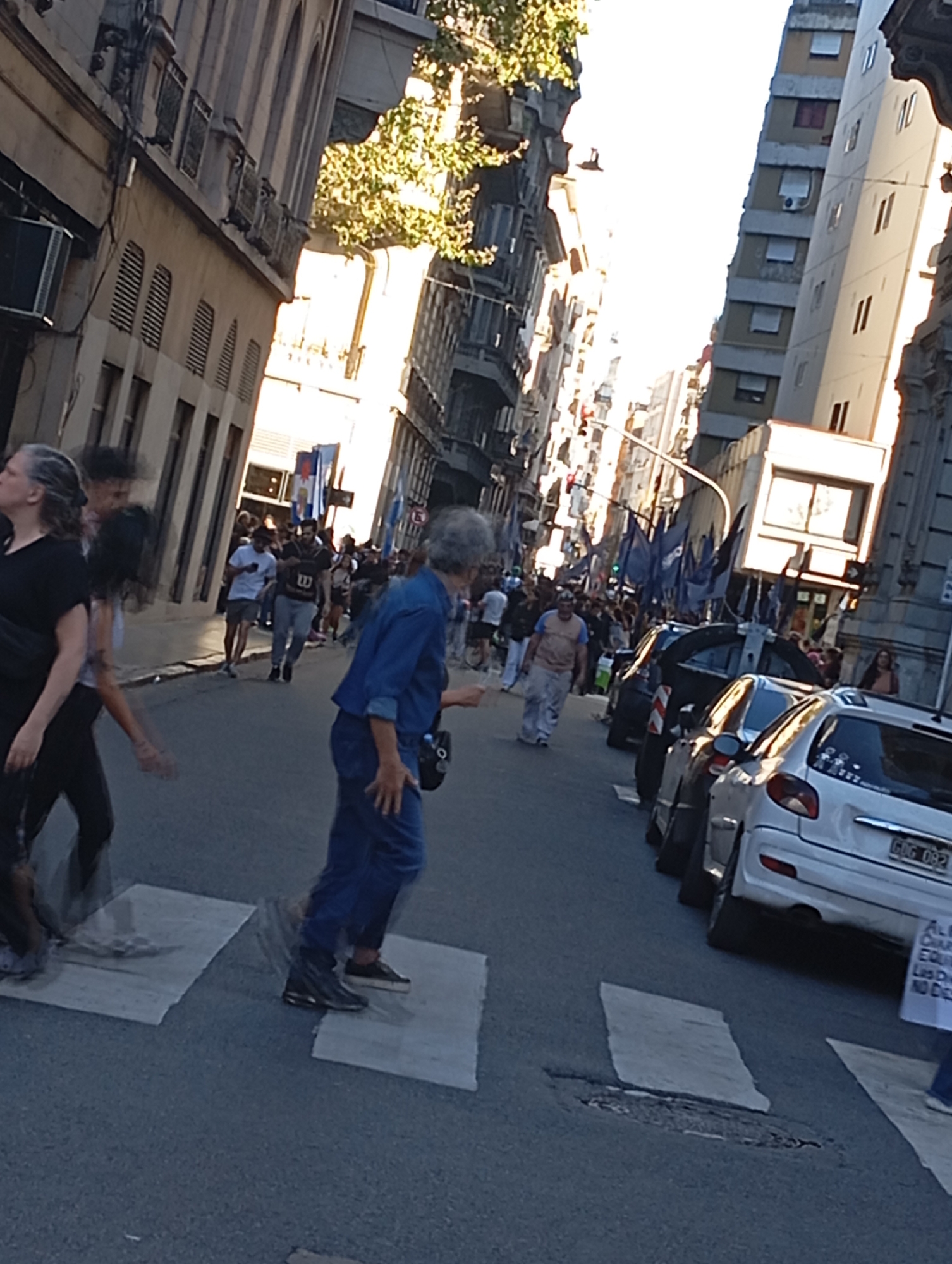 The scene depicts a bustling urban street in Buenos Aires, Argentina, under strong, low-angle sunlight. The light source appears to be from the background-right, casting distinct highlights and shadows across the multi-story buildings and street. In the foreground-left, a woman with graying hair, wearing a black top and carrying a dark shoulder bag, is partially visible and blurred, indicating motion. Beside her, another blurred individual, possibly male, in a white t-shirt, is also in motion. Centrally, a woman with short, curly gray hair, dressed in a blue denim shirt, blue jeans, and carrying a black shoulder bag, is captured mid-stride while crossing the asphalt street on a white-painted crosswalk. The street is paved, displaying some minor wear and multiple white pedestrian crosswalk markings. Several vehicles are parked parallel to the curb on the right side of the street. The most prominent is a white Peugeot 206 (or similar compact car) bearing an Argentine license plate "GDG 082". Behind this vehicle, a darker sedan is parked, and a white sign with partially legible Spanish text is visible. Further down the street, a substantial crowd of people is visible, many carrying numerous blue flags attached to poles, suggesting a procession or demonstration. Individuals within the crowd include a man in a white t-shirt with a distinct "W" logo and dark shorts, and another man in a light blue t-shirt and light-colored pants. Buildings line both sides of the thoroughfare. On the left, multi-story structures with light-colored facades, ornate architectural details, windows, and some balconies are visible, along with external air conditioning units. On the right, taller, more contemporary multi-story buildings also frame the street. Green foliage from trees protrudes above the building line on the left. A traffic signal or street lamp is suspended over the street in the distance.