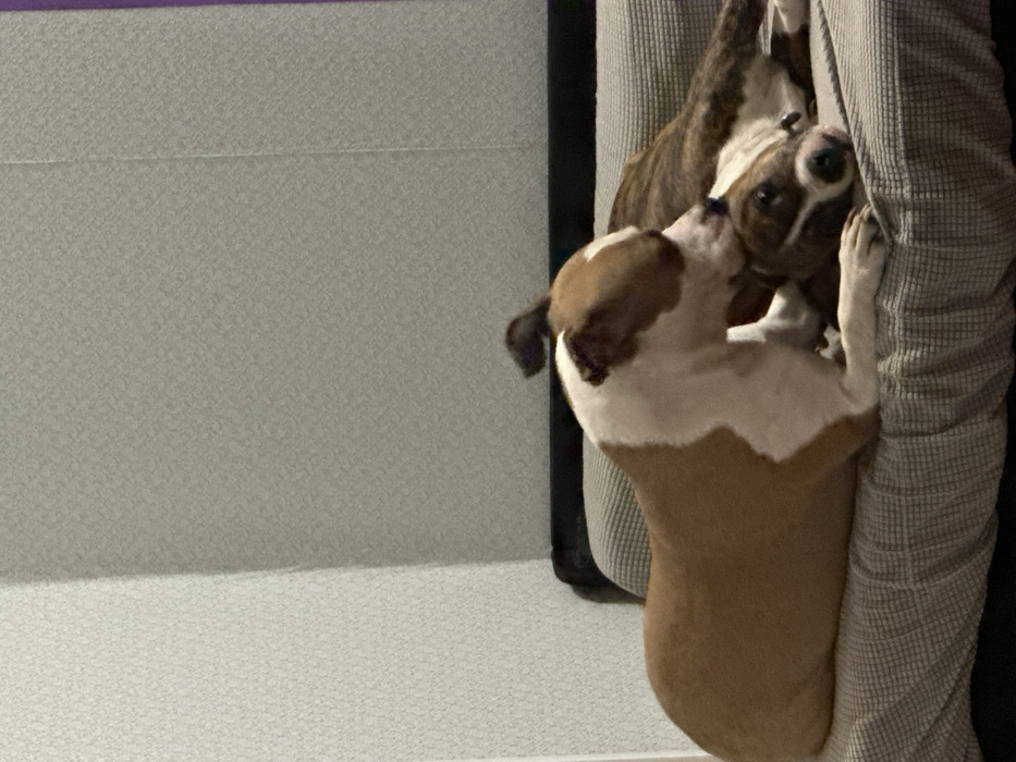 - "In an indoor setting within Nekrasovskiy, Russia, two domestic dogs are positioned on a grey, textured fabric sofa" by FM-2t2Dl2, licensed under CC BY 4.0
